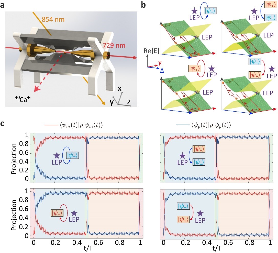 近日,精密测量院束缚体系量子信息处理研究组与广州工业技术研究院、宾夕法尼亚州立大学、湖南师范大学等合作,在超冷钙离子实验平台上,首次成功观测到了不包含刘维尔奇异点的手性量子热力学过程和手性量子态转换。这项研究成果不仅极大地降低了演示非厄米手性动力学的实验难度,也为研究非厄米量子系统中手性物理提供了新方法。相关研究成果发表在光学领域顶级国际学术期刊《光:科学与应用》(Light: Science & Applications)上。