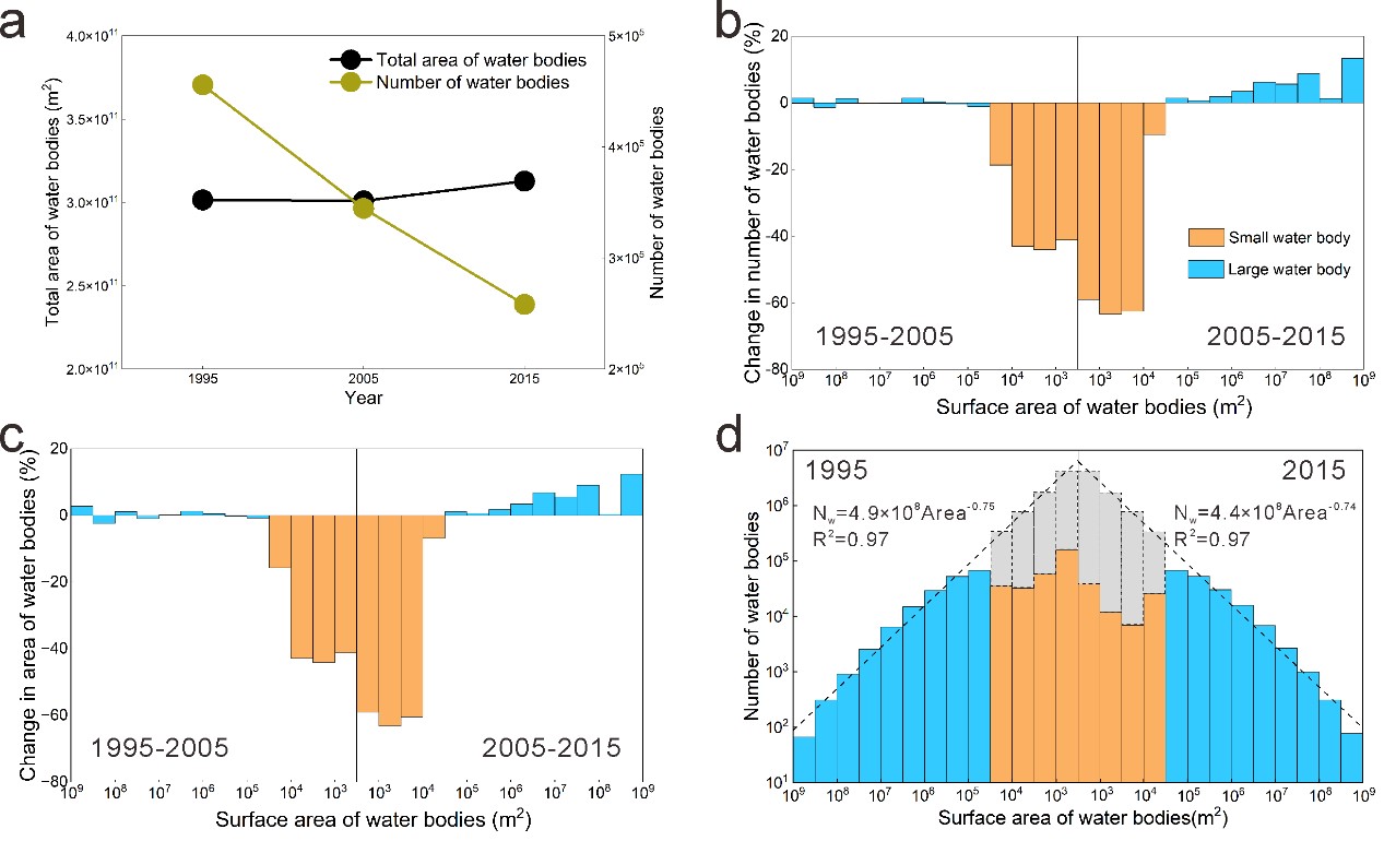 精密测量院张亮研究员团队,与加拿大滑铁卢大学、美国环保协会等单位合作,系统分析了我国近几十年来的湿地变化趋势,发现我国湿地总面积较为稳定,但是湿地数量却经历了快速下降,这种变化主要是小微湿地的快速流失所导致。基于湿地面积-数量的理论分布,估算了我国小微湿地(面积<3.2 ha)的潜在流失量。