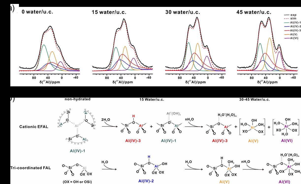 沸石分子筛凭借其规则有序的微孔结构和可调控的酸性,在石油化工与精细化工领域广泛应用。在分子筛的应用过程中,水扮演了多重角色,既可作为溶剂、反应物、产物,也能充当反应促进剂,同时还能通过改变分子筛的酸性来影响催化性能。然而,沸石分子筛中普遍存在的“NMR-invisible”铝物种,包括三配位骨架以及非骨架铝,作为主要的Lewis酸物种,其与水的作用机制尚未明确,导致其对催化反应的贡献常常被忽略。