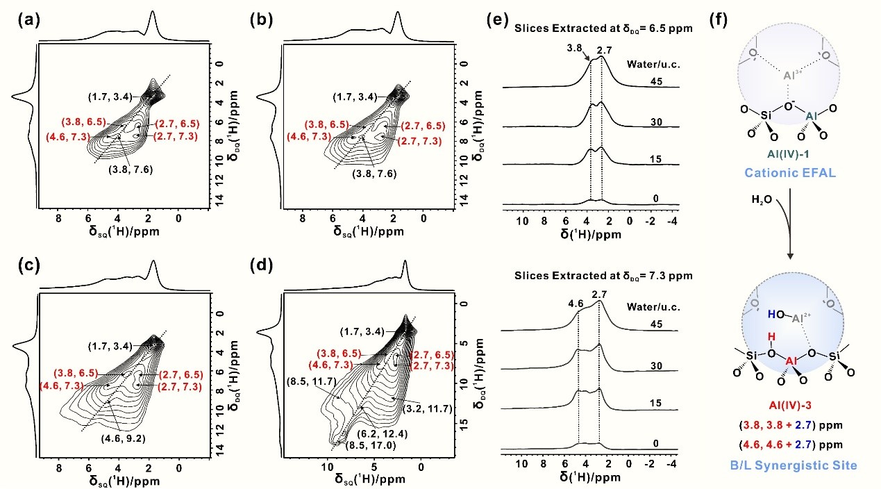 为揭示这一机制,研究团队利用多核固体NMR结合理论计算,深入探究了脱水USY分子筛中“NMR-invisible”铝物种与水作用以及转变过程。研究发现,水分子在“NMR-invisible”铝位点上容易发生解离吸附,生成大量Brønsted酸位(BAS增量超过60%)和Brønsted/Lewis协同酸位,显著提升USY分子筛的催化活性。研究团队首先利用一维27Al MAS NMR(图1a)分析了不同含水量下脱水USY分子筛中铝物种的转变过程,发现水会在“NMR-invisible”铝上发生解离吸附,转变为“NMR-visible”铝物种(四配位、五配位和六配位铝),产生大量Brønsted酸位(图1b)。进一步利用二维1H-1H DQ-SQ NMR实验研究了水解离生成的氢物种的空间分布(图2a-e),揭示了新生成的Brønsted酸质子和Al–OH空间邻近而导致的Brønsted/Lewis协同酸位(图2f)。基于以上实验结果,研究团队揭示了水与“NMR-invisible”铝物种的作用机制,阐明了一种由水驱动修饰分子筛活性位点的调控机制,为水存在时分子筛催化行为提供了新的见解。