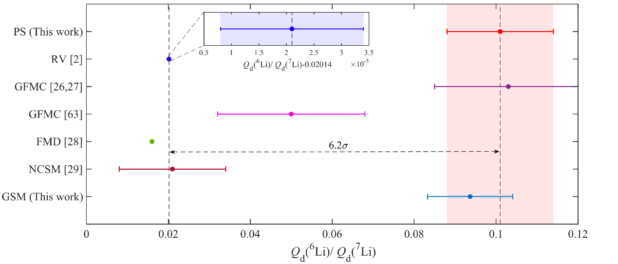 研究团队基于自主研制的亚稳态锂离子束源装置,在前期饱和荧光光谱方案的基础上,首次将光学Ramsey方法应用于离子束流测量,将谱线半高宽从50 MHz压缩至5 MHz,最终使Li⁺超精细结构光谱的测量精度从50 kHz提升至10 kHz,精度较国际上其他团队已发表的结果提高了1至2个数量级。通过高精度理论计算,研究团队进一步直接从原子光谱中提取了锂的核参数。结果显示,⁶Li电四极矩的测量值与现有推荐值存在显著偏差,但与Gamow壳模型的核结构理论计算结果一致。图1展示了采用多种方法得到的⁶Li与⁷Li核电四极矩的比值。