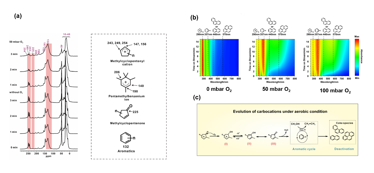 (a)分子筛上碳正离子在含氧/无氧气氛下演化的原位13C MAS NMR图谱;(b)不同氧分压条件下碳正离子演化的原位UV-Vis图谱;(c)分子氧氧化碳正离子反应机制