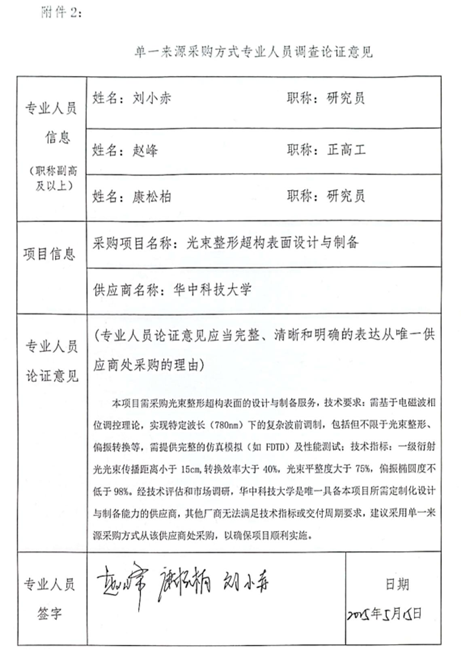 需采购光束整形超构表面的设计与制备服务,技术要求:需基于电磁波相位调控理论,实现特定波长(780nm)下的复杂波前调制,包括但不限于光束整形、偏振转换等,需提供完整的仿真模拟(如FDTD)及性能测试;技术指标:一级衍射光光束传播距离小于15cm ,转换效率大于40%,光束平整度大于75%,偏振椭圆度不低于98%。经技术评估和市场调研,华中科技大学是唯一具备本项目所需定制化设计与制备能力的供应商,其他厂商无法满足技术指标或交付周期要求,拟采用单一来源采购方式从该供应商处采购,以确保项目顺利实施。